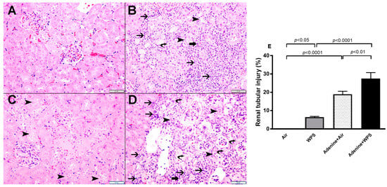 Alongside the classical biomarkers of renal injury (e.g., plasma urea and creatinine), here, we assessed the concentration and activity of some novel and more sensitive biomarkers of renal disfunction. KIM-1 is a relatively novel and sensitive biomarker of renal damage, and urinary concentrations KIM-1 have been reported to correlate with proteinuria []. NGAL concentration was initially used as a novel marker for acute kidney injury and we and others have validated its use as a reliable index of CKD [,]. NAG is a hydrolytic lysosomal enzyme found mainly in proximal tubules, and is considered a good marker of renal tubular injury []. Adiponectin, secreted from adipose tissue, has been reported to possess anti-inflammatory and anti-atherosclerotic actions in the healthy organism; however, in CKD, it is often elevated, and used as a biomarker of progression of CKD and a predictor of mortality []. It has been previously reported that KIM-1, NGAL, NAG and adiponectin increased in the urine of rats with adenine-induced CKD [,]. In the present study, we show for the first time that the levels of the aforementioned sensitive and specific biomarkers of kidney damage were substantially increased in mice with adenine-induced CKD and exposed to WPS compared with either the adenine + air group or WPS group.