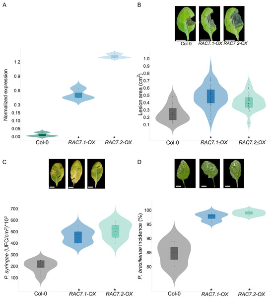 Infection assays were conducted using the RAC7.1-OX, RAC7.2-OX, and Col-0 lines with pathogens with different lifestyles. (A) Analysis of RAC7 expression in the RAC7.1-OX, RAC7.2-OX, and Col-0 lines without inoculation. CF150 (AT1G72150) was used as the normalization gene. (B) Leaves of RAC7.1-OX, RAC7.2-OX and Col-0 inoculated with B. cinerea, the lesion area was calculated 72 HPI. (C) Leaves of RAC7.1-OX, RAC7.2-OX, and Col-0 inoculated with P. syringae, UFC/cm2 was calculated as 72 HPI. (D) Leaves of RAC7.1-OX, RAC7.2-OX, and Col-0 inoculated with P. brasiliensis, the incidence rate was calculated as 72 HPI. In the boxplots, the center line represents means values of three independent experiments (n > 20); box limits, upper and lower quartiles; whiskers, 1.5× interquartile range; the points represent individual data points. The asterisk indicates statistical significance between the RAC7-OX lines and Col-0 according to a one-way ANOVA test and a post hoc analysis (p < 0.05). Pictures are representative images of lesion development. Scale = 1 cm (B–D). Arrows indicate yellowing lesions caused by P. syringae and dashed lines indicate lesions caused by P. brasilense infection.