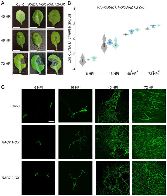 RAC7 overexpression increases the amount of B. cinerea infecting the leaves. (A) Lesion development at 40, 48 and 72 HPI in RAC7.1-OX, RAC7.2-OX, and Col-0. Quantification of B. cinerea gDNA in leaves of A. thaliana Col-0 and RAC7-OX lines at 6, 16, 40 and 72 HPI. (B) In the boxplots, the center line represents means values of three independent experiments (n > 20); box limits, upper and lower quartiles; whiskers, 1.5× interquartile range; the points represent individual data points. The asterisk indicates statistical significance between the RAC7 overexpressors and Col-0 according to a one-way ANOVA test and a post hoc analysis (p < 0.05). (C) Growing of B. cinerea tagged with GFP in RAC7.1-OX, RAC7.2-OX, and Col-0 at 6, 16, 40 and 72 HPI. Scale = 1 cm (A), 50 µm (C).
