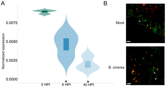 RAC7 behavior in response to B. cinerea infection. (A) Transcript expression profile in Col-0 leaves infected with B. cinerea at 0, 6, and 40 HPI. Normalized expression was calculated using 2−ΔCt and normalized with respect to CF150. The box represents mean values (±SD) of three independent experiments (n > 20). The asterisk indicates statistical significance between the 6 and 40 HPI with respect to 0 HPI, according to a one-way ANOVA test and a post hoc analysis (p < 0.05). (B) Subcellular location of RAC7 (35S::GFP:RAC7) in N. benthamiana leaves with and without B. cinerea inoculation (24 HPI). The arrows indicate the cytoplasmic membrane and the arrowheads the cytoplasm. Scale = 20 µm.
