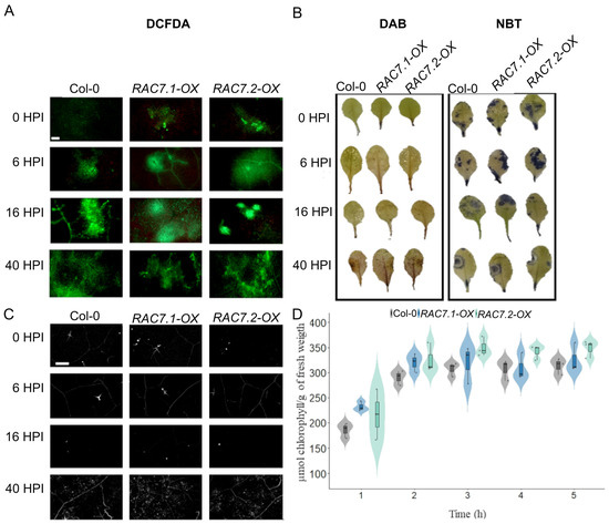 Plants have performed chemical and physical barriers that attempt to prevent pathogen development such as cuticle, cell wall, ROS accumulation, and callose deposition [22,23,24,25]. To assess whether RAC7-OX lines were impacted in canonical plant defense mechanisms, we evaluated ROS accumulation, and callose deposition at 0, 6, 16, and 40 HPI (Figure 4A,B). In addition, we measured permeability by quantifying chlorophyll leaching for 5 h, at intervals of 1 h (Figure 4C). We found that the levels of ROS, callose and chlorophyll leaching were similar in RAC7-OX lines compared to Col-0 plants (Figure 4A–C). These results suggest that the susceptibility caused by RAC7 overexpression is not due to these changes in canonical defense mechanisms.