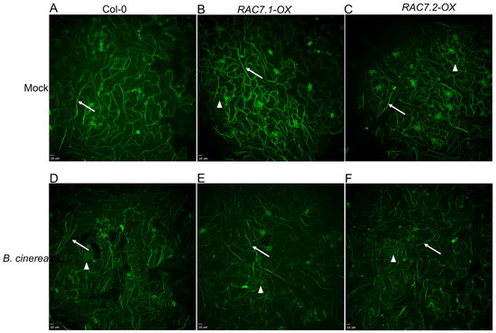 Actin cytoskeleton organization in epidermic cells of Col-0 and RAC7-OX. (A,D) Imaging of the actin microfilament organization in Col-0, (B,E) RAC7.1-OX, and RAC7.2-OX (C,F), without (A–C) and with B. cinerea at 6 HPI (D–F). The arrows point to long filaments and arrowheads indicate fragmented filaments. Scale 10 μm.