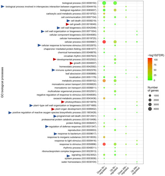 Gene ontology (GO) enrichment of RAC7-OX vs. Col-0 DEGs at 0 and 40 HPI. The bubble color indicates the significance of the term (−log10 FDR), and the size indicates the number of genes associated with each term. The blue and red triangles indicate GO related to plant defense against pathogens and development, respectively.