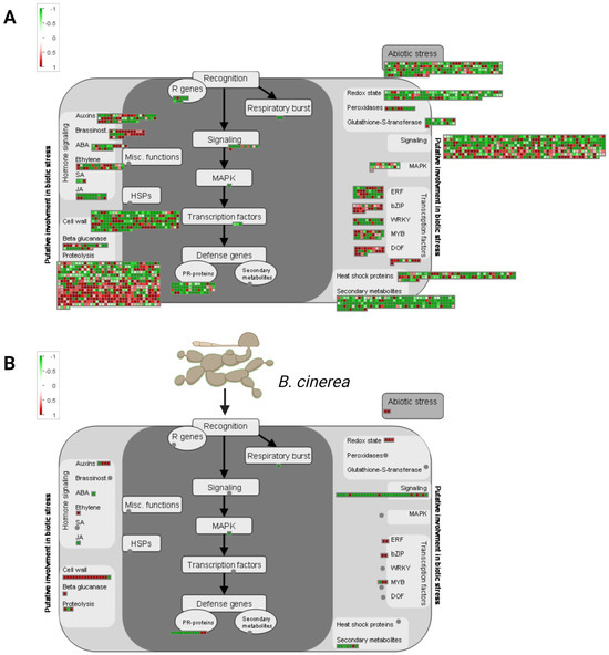MapMan visualization of RAC7-OX DEGs in the plant biotic stress category at (A) 0, and (B) 40 HPI. The squares represent significantly differentially expressed Arabidopsis TAIR10 gene models (padj < 0.05) from the corresponding categories, in the indicated conditions. Log2 fold changes are indicated as a gradient between red (1) and green (−1). The grey dot represents the lack of significantly differentially expressed genes in the corresponding category.
