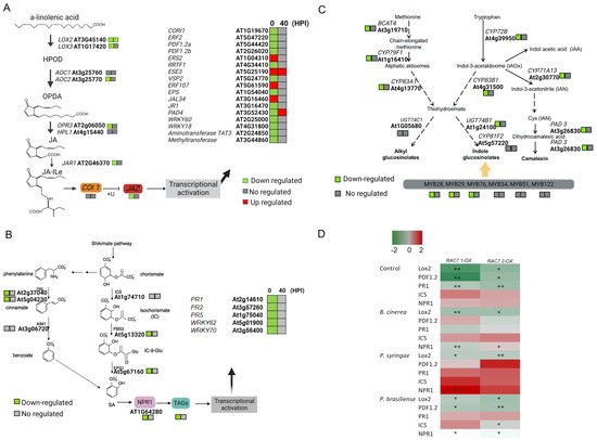 Hormonal, glucosinolates and camalexin biosynthesis is downregulated in RAC7-OX. (A) Jasmonic acid, (B) Salicylic acid, (C) Glucosinolates and Camalexin biosynthesis pathways, signal transduction, and induced genes. The squares represent 0 HPI and 40 HPI. Log2 fold changes are indicated as a gradient between red (1) and green (−1). Grey represents the lack of significantly differentially expressed genes in the corresponding category. (D) Log2FC of LOX2, PDF1.2, PR1, ICS1, NPR1 at basal conditions and treated with B. cinerea (40 HPI), P. syringae (24 HPI), and P. brasilense (24 HPI). The asterisks indicate significant difference: * p < 0.05; ** p < 0.01.