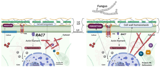 Schematic representation illustrating how the RAC7 would potentially negatively regulate plant immunity in A. thaliana by modulating the actin cytoskeleton and Ca++ signaling. In the Col-0 plants, in no challenge conditions, the level of RAC7 expression keeps suppressed process related to plant defense such as pathogen perception, cell wall homeostasis, signal transduction, JA and SA induction, and antimicrobial secondary metabolism (SM) biosynthesis. Once a pathogen infects the plant, RAC7 expression is suppressed and the inhibition is blocked, resulting in immunity activation. Created with BioRender.com.