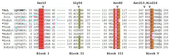 Sequence analysis placed SrL into the SGNH-hydrolase superfamily (Pfam: CL0264) and GDSL-2 family (Pfam: PF13472) composed primarily of bacterial sequences [19]. The crystal structure determination revealed its similarity to the 3D structures of phospholipase A1 from Streptomyces albidoflavus and esterase from Streptomyces scabies. Several biochemically well-characterized and structurally resolved enzymes belonging to the GDSL-2 family were selected (Figure 1), and a multiple-sequence alignment was performed. Figure 1 shows the sequence conservation within the four blocks and the presence of catalytically important residues. To question the functional importance of conserved residues Ser10, Gly54, Asn82, and His216, belonging to blocks I, II, III, and V (Figure 1), lipase variants in which those residues were substituted by alanine were generated. Since SGNH hydrolases from genus Streptomyces (three out of four) did not have a highly conserved Asp in block V, additional lipase variants Asn213Ala and Asn213Asp were prepared to investigate whether the Asn213, a residue near the assumed catalytic His 216, influenced SrL activity.