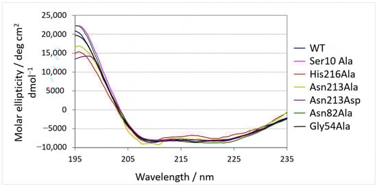Recombinant SrL and its mutants were produced in S. lividans TK23 and purified to homogeneity as described in Section 4. First, it was analyzed whether the introduced mutations led to conformational changes in the SrL variants. Structural characteristics of purified enzyme variants together with WT lipase were evaluated by circular dichroism (CD). As shown in Figure 2, almost identical CD spectra were obtained for all proteins, suggesting that the introduced mutations did not lead to changes in the secondary structures of the proteins.