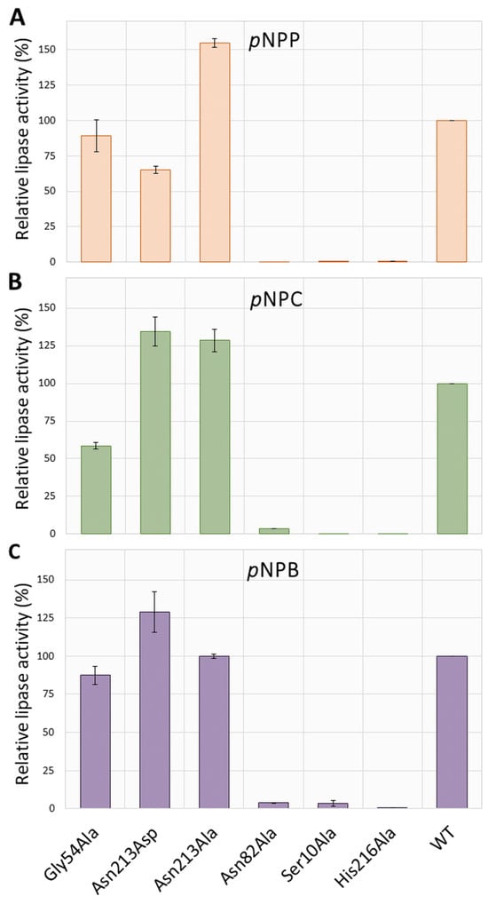 Next, the specific activity of the purified enzymes was determined for three pNP esters with different fatty acid chain lengths: p-nitrophenyl butyrate (pNPB; C), p-nitrophenyl caprylate (pNPC; C8), and p-nitrophenyl palmitate (pNPP; C16). As shown in Figure 3, hydrolytic activity of Ser10Ala, Asn82Ala, and His216Ala was abolished for all examined substrates. The replacement of Gly54 with alanine residue decreased lipase activity with pNPC by about 40%, while the hydrolysis of pNPP and pNPB was almost unchanged (~10% decrease), compared with WT SrL. The substitution of Asn213 with Ala produced an enzyme variant with significantly higher activity for pNPP (~55%) and pNPC (~29%), while the activity toward pNPB remained unchanged in comparison with WT. The activity of mutant Asn213Asp was moderately enhanced toward pNPB (~29%) and pNPC (~34%) but decreased by ~35% with long acyl chain length substrate pNPP, compared with WT (Figure 3).