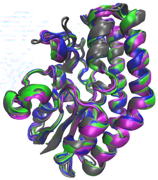 Overlay of the structures of WT SrL (colored magenta) and its mutants Asn213Ala (colored blue), Gly54Ala (colored gray), and Asn82Ala (colored green) obtained after 300 ns of MD simulations at 300 K in water (OPC water molecules) solution.