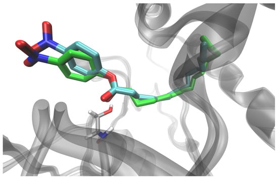 Orientation of the ligand in the SrL–pNPP complex, obtained by ASMD simulation (cyan), for the pNPP with alkyl chain accommodated in tunnel 1 and after additional 100 ns of unconstrained MD simulation of the solvated complex at 290 K (green). The position of Ser10 in the later structure is shown (light gray sticks).