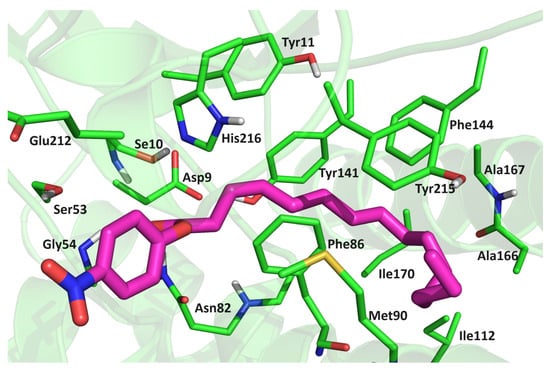 The web tool CAVER 3.0 (CAVER Web—tool for the analysis of tunnels and channels in protein structures (https://caver.cz/, accessed on 17 August 2021) [22] was used to determine the catalytic cavity in WT SrL. In addition, ASMD simulations were used to determine the possible orientations of pNPP in the cavity (see Section 4 for details of the procedure). The ASMD simulations were carried out for two different initial structures, i.e., for two different positions of the pNPP. In one, pNPP was placed in tunnel 3 (cyan) with the tail of the alkyl chain solvated (ASMD-T3 set), and in the other, the alkyl chain of pNPP was placed in tunnel 1 (green) with the phenyl ring and NO2 group solvated (ASMD-T1 set) (Figure S4). The SrL–pNPP complexes obtained as a result of the ASMD simulations were visually examined, and it was found that the orientation of pNPP in the complex obtained starting from the structure accommodated in tunnel 1 was more suitable for hydrolysis than the pNPP orientation in the complexes obtained starting from the alkyl chain occupying tunnel 3. In both cases, the most suitable conformation of the ligand was in the complexes obtained with a puling step of 0.5 Å. These structures were further simulated for 100 ns at 290 K. During the simulation of the structure from the ASMD-T3 set, pNPP moved away from Ser10, and most of the alkyl chain remained solvated (Figure S5). On the other hand, pNPP from the ASMD-T1 set remained close to the initial position and was nicely accommodated in the SrL catalytic pocket (see Figure 5) during the 100 ns of unconstrained MD simulations. MM/GBSA binding free energies also revealed higher stability of the complex from the ASMD-T1 set than from the ASMD-T3 set (−65.6 ± 4.2 kcal/mol vs. −43.6 ± 4.3 kcal/mol).