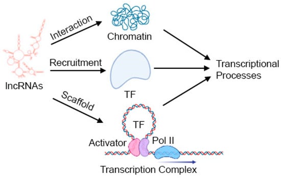 One of the primary mechanisms through which lncRNAs operate is the regulation of gene expression. They can modulate transcriptional processes by interacting with chromatin, acting as scaffolds for transcriptional complexes, or influencing the recruitment of transcription factors (Figure 2). lncRNAs also regulate gene expression at post-transcriptional and translational levels.