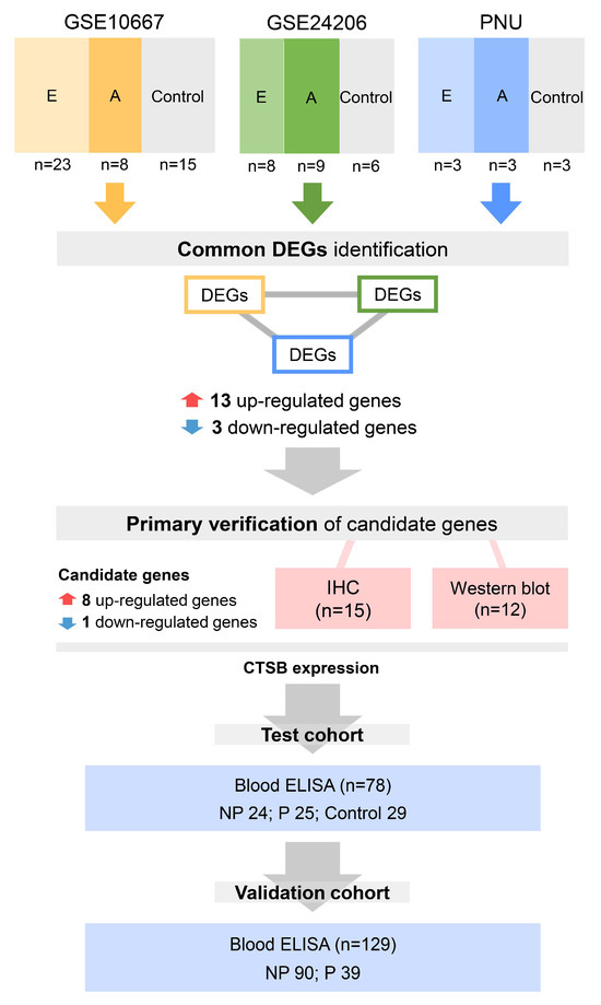 Workflow of this study. We first independently compared the different gene expression levels among a total of 78 lung tissue samples from control, early IPF, and advanced IPF patients in the GSE10667, GSE24206, and PNU datasets. We found common DEGs that were significantly 13 up-regulated or three down-regulated in the control, advanced IPF, and early IPF datasets. Among the 16 genes common to the three datasets, gene validation was conducted for only nine genes, including eight up-regulated genes (CD276, COL7A1, CTSB, GLI2, PIK3R2, PRAF2, IGF2BP3, and NUPR1) and one down-regulated gene (ADAMTS8). Immunohistochemical staining was performed on 15 lung tissue samples (control three vs. early IPF 6 vs. advanced IPF 6). Western blot analysis was also performed on 12 lung tissue samples (control three vs. early IPF 5 vs. advanced IPF 4). To test the possibility of using CTSB as a biomarker, serum CTSB was retrospectively measured in the test cohort (n = 78) using ELISA. Finally, to validate the possibility of using CTSB as a biomarker, serum CTSB levels were prospectively measured in the independent IPF clinical cohort (validation cohort; n = 129). E: early IPF; A: advanced IPF; DEGs: differentially expressed genes; IHC: immunohistochemistry; ELISA: enzyme-linked immunosorbent assay; NP: nonprogressive IPF; P: progressive IPF; IPF: idiopathic pulmonary fibrosis.