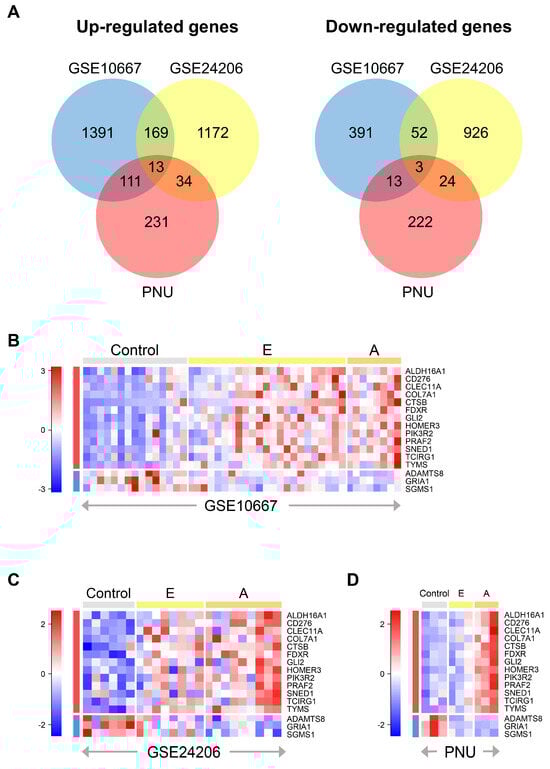 Identification of DEGs. (A) Venn diagrams show the overlapping DEGs among the three datasets: up-regulated genes (left) and down-regulated genes (right). We used the ANOVA or Kruskal–Wallis rank sum test to compare different expression levels among the three groups (control, early IPF, and advanced IPF). Each circle represents the number of independently up or down-regulated genes in each dataset. Heatmap of scaled gene expression of 16 common DEGs in the three datasets: (B) GSE10667, (C) GSE24206, and (D) PNU. Red indicates high relative expression, and blue indicates low relative expression. The rows represent 13 up-regulated genes and three down-regulated genes in order, and the gray, yellow, and orange bars at the top of the heatmap represent control, early, and advanced IPF samples, respectively. DEGs: differentially expressed genes; E: early IPF; A: advanced IPF; DEGs: differentially expressed genes; IPF: idiopathic pulmonary fibrosis; ANOVA: analysis of variance.