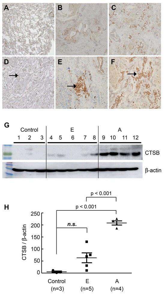 Representative image of immunohistochemistry CTSB and Western blot. (A) Control; (B) early IPF; (C) advanced IPF; (D) control; (E) early IPF; (F) advanced IPF; IHC staining and Western blot were performed on tissue from the right lower lobe area of control, early IPF, and advanced IPF. The staining of CTSB was increased in advanced IPF compared to that in the control and in early IPF, marking macrophages in the honeycomb region. Arrows indicate macrophages stained for CTSB. A negative control was added, as shown in Figure S2. (G) Western blot. In the Western blot, each group was marked separately using a dividing line. (H) CTSB expression levels in control vs. early IPF vs. advanced IPF. CTSB was increased in advanced IPF compared to the control and early IPF. Each short bar below and above represents the first and third quartiles of expression, and each central long bar represents the median value. E: early IPF; A: advanced IPF; IPF: idiopathic pulmonary fibrosis; n.s.: no significance.