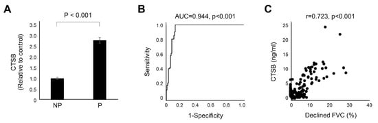 CTSB in progressive IPF. Data represent normalized values relative to the control, which is considered to have a value of 1. (A) Bar charts with error bars are presented as the median and 95% confidence intervals around the median. (B) ROC curve of CTSB. CTSB significantly predicted progressive IPF (AUC = 0.944, p < 0.001). (C) There was a significant correlation between CTSB and decreased FVC per year (r = 0.723, p < 0.001). NP: nonprogressive IPF; P: progressive IPF; AUC: area under the curve; FVC: forced vital capacity; ROC: receiver operating characteristic.