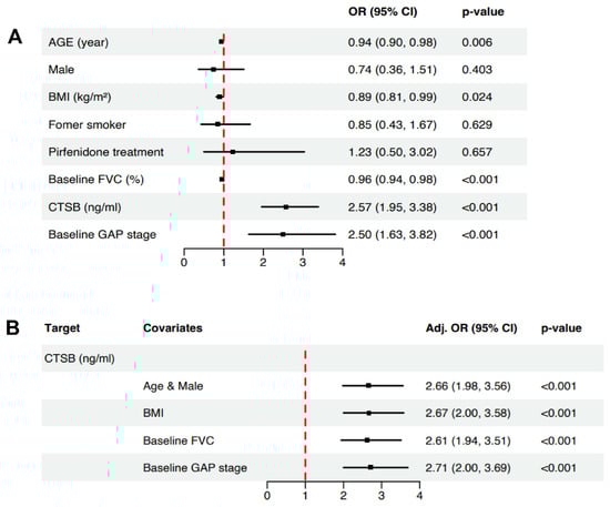 Logistic regression analysis. (A) Forest plot for univariate logistic regression analysis. As a result, age (OR = 0.94, 95% CI 0.90–0.98, p = 0.006), BMI (OR = 0.89, 95% CI 0.81–0.99, p = 0.024), baseline FVC (OR = 0.96, 95% CI 0.94–0.98, p < 0.001), and CTSB level (OR = 2.57, 95% CI 1.95–3.38, p < 0.001) were significantly associated with progressive IPF. (B) Forest plot for adjusted OR analysis. After we adjusted for baseline FVC, CTSB was significantly associated with progressive IPF (adjusted OR = 2.61, 95% CI 1.94–3.51, p < 0.001). OR: odds ratio; CI: confidence interval; FVC: forced vital capacity; GAP: gender-age-physiology.