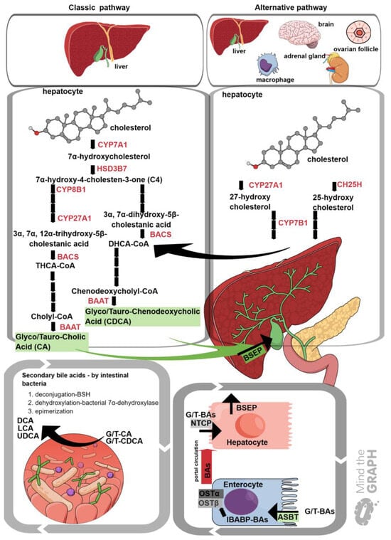 Bile acids (BAs) are amphipathic molecules with a steroid structure, known for their role in regulating fat digestion and the absorption of liposoluble vitamins, owing to their strong detergent properties [15,16]. Along with their well-known function as emulsifiers, BAs are very important signaling molecules in regulating various processes including glucose, lipid metabolism, cholesterol homeostasis, and immunity [16,17]. BAs are synthesized mostly in the liver, secreted and concentrated in the gallbladder, and, upon meal uptake, released into the small intestine [18]. Two BA synthesis pathways have been described: classical (neutral) and alternative (acidic) [19]. The classical pathway starts by converting the cholesterol backbone to a more hydrophilic structure of 7α hydroxy cholesterol, mediated by enzyme cholesterol 7α hydroxylase (CYP7A1). CYP7A1 is a member of the cytochrome P450 family and is a crucial enzyme for cholesterol metabolism and a rate-limiting enzyme for BA synthesis in the liver [20]. CYP7A1 is expressed in the endoplasmic reticulum (microsome) of the hepatocytes [21]. Next, 7α-hydroxycholesterol is converted to 7α-hydroxy-4-cholesten-3-one (C4), by hydroxysteroid dehydrogenase 3B7 (HSD3B7) [21]. C4 is also described as a surrogate serum marker for BA synthesis [21,22,23]. In the presence of sterol 12α-hydroxylase (CYP8B1), C4 is directed towards cholic acid (CA) synthesis, whereas, in the absence of CYP8B1, C4 is directed towards chenodeoxycholic (CDCA) acid synthesis [21]. Trihydroxycholestanic acid (THCA) and dihydroxycholestanic acid (DHCA) are products of a reaction mediated by mitochondrial sterol 27-hydroxylase (CYP27A1). THCA and DHCA are activated by bile acid-CoA synthetase (BACS, long-chain acyl-CoA synthetase, SLC27A5) and transferred into peroxisomes, where the formation of cholyl-CoA and chenodeoxycholyl-CoA occurs [21]. These bile acyl-CoAs are conjugated with the amino acids glycine (G) or taurine (T) by the enzyme bile acid-CoA amino acid N-acyltransferase (BAAT) [21,24]. Glyco/tauro cholic acid and glyco/tauro chenodeoxycholic acids formed through conjugation show increased solubility at their physiological pH to form sodium salts, and BAs are stored in the gallbladder until meal uptake stimulates the release of bile [21]. The alternative BA synthesis pathway is initiated by sterol 27-hydroxylase (CYP27A1) to form 25(R)-26-hydroxycholesterol, and the intermediates of the alternative pathway are shuttled in the cycle of chenodeoxycholic (CDCA)-bile acid production [19,21,25].