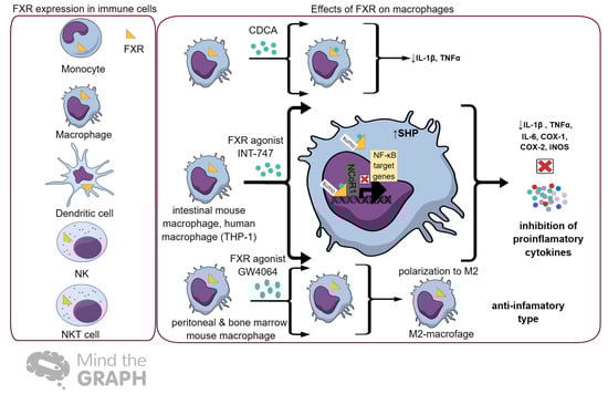 Nuclear receptors (NRs) of BAs, including FXR, CAR, and PXR, are expressed in human immune cells such as CD4 T cells, CD8 T cells, CD19 B cells, CD14 monocytes, macrophages, dendritic cells. and peripheral blood mononuclear cells [70]. The membrane receptor TGR5 is also expressed in monocytes and macrophages [14]. The release of pro-inflammatory cytokines, such as TNFα and IL-1 during acute immune responses, negatively regulates the expression of FXR, CAR, and PXR [70,71]. Additionally, NRs inhibit CYP7A1 (cholesterol 7α-hydroxylase), leading to cholesterol accumulation [70,72]. Cholesterol through LXR and BAs through FXR affect T-cell-mediated immune responses. The regulatory role of FXR in innate immunity and homeostasis was described by Vavassori and his colleagues. Colonic inflammation in mice was enhanced in the absence of FXR, leading to the progression of immune-mediated disease. When a synthetic FXR ligand 6-ethyl chenodeoxycholic acid (6E-CDCA) was supplied to mice with colonic inflammation, the inhibitory regulation of NF-κB-dependent genes (TNF-α, IL-1β, IL-6, COX-1, COX-2, and iNOS) and induction of SHP were observed, resulting in disease weakening. The activation of FXR by synthetic agonists directs FXR to the promoters of IL-1β and iNOS, contributing to the stabilization of the nuclear co-repressor on the promoters [61]. FXR affects macrophage activation in the liver and intestine [73,74]. Proinflammatory M1 macrophages are important for initiating adaptive immunity and tissue inflammation [75]. M1 macrophages can cause tissue damage and alter the wound-healing process. In contrast, M2 macrophages regulate tissue regeneration and remodeling [75]. In a study by Jaroonwitchawan et al., an FXR agonist, GW4064, applied both in vitro and in vivo, promoted the polarization into M2 macrophages, along with the upregulation of the retinoic acid pathway [75]. The inhibition of retinoic acid resulted in the suppression of the FXR-mediated polarization of M2 macrophages [75]. Thus, GW4064 treatment may be a therapeutic strategy to promote M2-macrophage-mediated tissue remodeling and repair [75]. Significant effects of FXR in the immune cells within so-called “classical BA-target” organs including the intestine and liver have extensively been elaborated. The noteworthy mechanisms underlying FXR-deficiency-mediated inflammation and fibrogenesis in the lung have been depicted by Murray et al. [76]. FXR is expressed in alveolar epithelial cells, resident alveolar macrophages, pulmonary endothelial cells, and lung fibroblasts [76]. In vivo studies conducted on rats exposed to nitrogen mustard (NM) showed decreased FXR expression, the accumulation of oxidized lipids in lung macrophages, and the formation of macrophage foam cells, leading to pulmonary fibrosis [76]. Targeted deletion of the FXR gene in mice supports its key role in regulating both pro- and anti-inflammatory macrophage activation following NM-induced lung injury and oxidative stress [76]. The loss of FXR results in increased numbers of pro-inflammatory/cytotoxic M1 macrophages in the lungs in response to NM-induced injury [76]. Campbell and his colleagues demonstrated that FXR functioned in effector T cells to promote alternative physiological responses to decreased nutrients [77]. The deletion of FXR in T cells prevented the starvation-induced loss of lymphocytes and increased effector T-cell fitness under nutrient-limiting conditions [77]. The main effects of FXR on macrophages are illustrated in Figure 2.