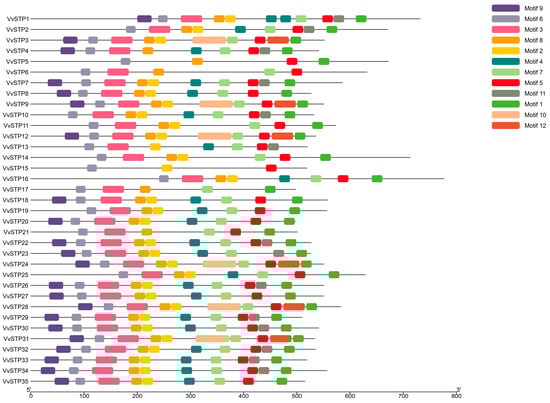 Distribution of conserved motifs of all 35 VvSTPs identified by MEME with the amino acid sequences. Conserved motifs are length-proportional and presented by boxes of different colors among the none-conserved sequences represented by gray lines.