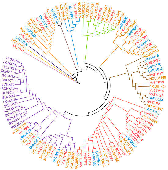 All STPs for the analysis were grouped into 11 clades, which were labeled with different colors, by the tenth node of the phylogenetic tree (Figure 3). Since S. cerevisiae is a yeast, it is not surprising that all of its STPs are clustered in a clade without another STP gene. STPs from all three filamentous fungi interlaced. However, most of the VvSTPs belonged to the clade whose branch was colored red, and shared a father clade with STPs of S. cerevisiae, which indicates that most VvSTPs are more closely related to those of S. cerevisiae than STPs from two other filamentous fungi. Compared with other VvSTPs and the STPs of the other two reference fungi, VvSTP1 showed distant similarities, which suggests that it may be a unique STP and differ from other known fungal STPs. Except for VvSTP1, VvSTP27 and VvSTP29 are also more distantly related to other VvSTPs. VvSTP8 and VvSTP35 showed a closer relationship with STPs from N. crassa, such as NCU09321, than with the majority of VvSTPs. Several STP genes from N. crassa and U. maydis, such as NCU07607 and UM03274, were grouped with VvSTP genes.