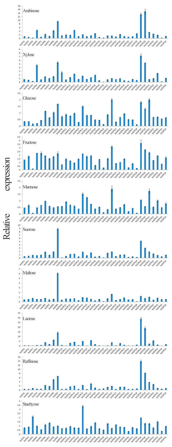 The expression of VvSTPs differed according to the sole carbon source, as shown in Figure 4. Arabinose and fructose generally increase the expression of VvSTPs, while maltose, mannose, and glucose generally decrease the expression of VvSTPs. VvSTP9 and VvSTP29 maintained a higher expression level within all VvSTPs and carbon sources, while VvSTP20 and VvSTP3 expressed at a lower level. The expression of almost all VvSTPs was reduced when growing on a medium containing sucrose as the sole carbon source, with the exception of VvSTP22 and VvSTP29. The expression of most VvSTPs was also decreased when the sole carbon source of stachyose was used, the most preferred carbon source of V. virens [33]. However, the expression of VvSTP15 and VvSTP3 increased by over two-fold when stachyose was used. In the presence of glucose, the most important monosaccharide, most VvSTPs were inhibited and only three VvSTPs, VvSTP22, VvSTP31, and VvSTP29, increased more than 1.5 times.