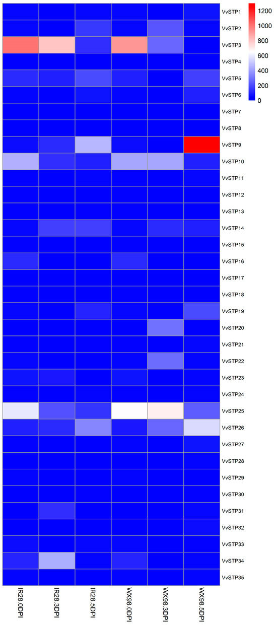 RNA-seq was used to compare the expression pattern of VvSTPs after inoculation on resistant and susceptible varieties. Figure 6 shows that expression patterns of VvSTPs can be divided into five groups based on changes in the trend. Group 1, including VvSTP 5, 6, 9, 11, 14, 19, 24, 26, and 30, exhibited a higher expression level 5 DPI in both resistant and susceptible varieties. Group 2, including VvSTP 3, 10, 12, 15, 16, 20, 23, 25, 29, and 34, showed a decreased expression level 5 DPI in both resistant and susceptible varieties. VvSTP2, VvSTP13, and VvSTP33 belonged to group 3, in which the expression level on IR28 increased while on WX98, it decreased or remained unchanged compared to the control. In addition, the expression level on IR28 remained the same while on WX98, it declined 5 DPI. On the contrary, VvSTP1, 18, 21, 22, 27, 28, 31, 32, and 35 belong to group 4, in which the expression level on IR28 dropped while on WX98, it rose or was unchanged. In addition, the expression level on IR28 remained the same while that on WX98 increased 5 DPI. The rest of VvSTPs, including VvSTP 4, 7, 8, 17, and 20, were classified into group 5, which did not obviously respond to the inoculation. It is only considered that expression of a gene has been changed when the difference exceeds a 10 FPKM value and 1.5-fold.