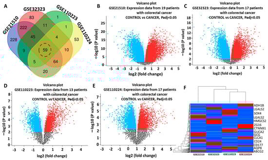 Identification of potential differentially expressed genes (DEGs) related to colorectal cancer (CRC). (A–D) Volcano plots showing differentially expressed genes (DEGs) in the array datasets between CRC patients and the control groups. (E) Venn diagram showing 59 overlapping upregulated DEGs in each dataset from all CRC datasets. (F) Heat maps of the overlapping upregulated DEGs obtained from the four datasets. Among the 59 upregulated DEGs were (ADH1B, LGALS2, SOX4, LGALS2, HMGCS2, ZG16, CTNNB1, GUCA2, GCG, CLCA1, CD24, CD177, AQP8, and ABCG2).