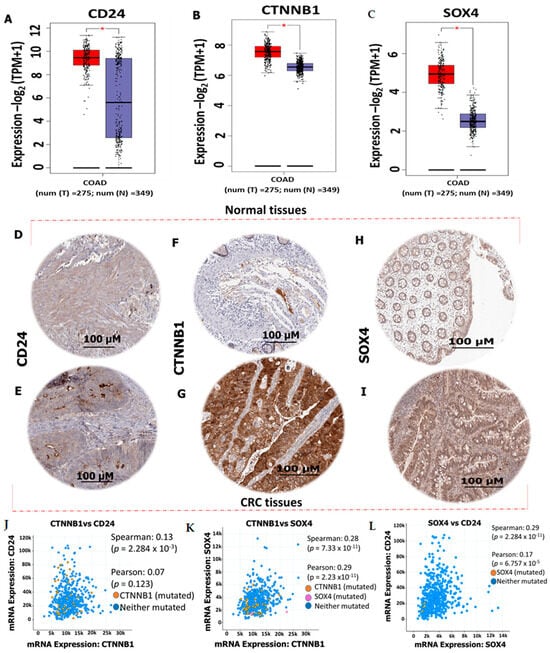 CD24/CTNNB1/SOX4 oncogenes are overexpressed in CRC tissues as compared with normal tissues. (A–C), high expression levels of CTNNB1, CD24, and SOX4 in CRC. HPA staining intensity was analyzed based on medium staining (D–I) intensities of CD24, CTNNB1, and SOX4 in normal colon tissues compared with CRC tissues. Overexpression of CD24/CTNNB1/SOX4 is associated with poor prognosis in CRC. Co-expression of (J) CTNNB1 with CD24 (K) CTNNB1 with SOX4, (L) SOX4 with CD24 in CRC. The staining quality was <75%, and * p < 0.05 was considered statistically significant.