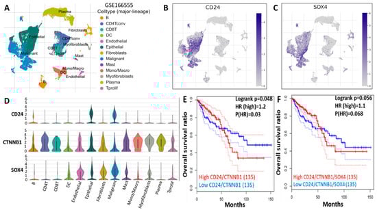 We first searched and analyzed a dataset containing 12 CRC patients’ samples (66,050 cells using a 10× genomics platform) [] (Figure 3A). We first explored an established cancer stemness marker, CD24 (Figure 3B) and an EMT marker for SOX4 expression (Figure 3C). CD24 expression was predominantly in the malignant and epithelial cell clusters. CD24/CTNNB1/SOX4 expression was detected in multiple cell clusters, including malignant, endothelial, epithelial, fibroblast, myofibroblast, and DC cell clusters (Figure 3D). We then queried the TCGA datasets using GEPIA2 software. We found that increased CD24/CTNNB1/SOX4 expression was associated with shorter overall survival (Figure 3E,F).