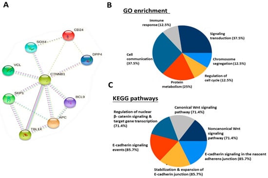 PPI networks centered around CD24/CTNNB1/SOX4. Interactions are shown after considering the gene neighborhood, gene fusion, gene co-occurrence, and co-expression of (A) DPP4 with CTNNB1, CD24 with CTNNB1, SOX4 with CTNNB1, DPP4 with CD24, and SOX4 with CD24. (B) Six biological processes associated with CD24/SOX4 oncogenic signature-correlated gene clusters. (C) KEGG pathway showing six affected pathways by CD24/SOX4/DPP4/CTNNB1 oncogenic signatures, which were significantly associated with several functions, represented in percentages (%).