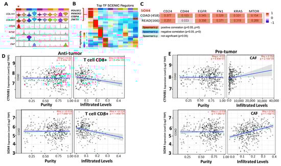 A seminal study by Qi et al. indicated that heterogenous CAF populations infiltrate the CRC tumor microenvironment []. One subtype of CRC-infiltrating CAFs was CD24+ (the first column denoted by the red asterisk, Figure 5A). High expression levels of COL1A1 and COL3A characterize these CD24+ CAFs. Further analyses classified different CAF-associated gene sets by transcriptional factor (TF) regulon. CD24+ CAFs were found which were most significantly associated with TF regulon: POU5F1 (OCT6), PKNOX2, CEBPA, and ZNF71 [] (Figure 5B). This TF regulon participates in the Wnt-mediated tumorigenesis, and multiple intracellular intrinsic and innate immune systems [,]. Also, the TIMER2.0 program analysis results showed that increased SOX4 expression was positively associated with the increased expression of multiple oncogenes, including EGFR, FN1, KRAS, and mTOR (Figure 5C). CTNNB1/SOX4 expression in CRC tumors was significantly associated with tumor-infiltrating CAFs (Figure 5D).