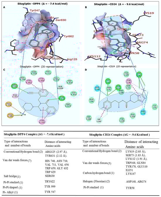 Molecular docking profiles of sitagliptin with the DPP4/CD24 oncogenes. (A,B) Three-dimensional representation showing strong binding energies of sitagliptin with DPP4 at Δ = −7.4 kcal/mol and of CD24 at Δ = −9.6 kcal/mol, respectively. (C,D) Two-dimensional visualization of docking results of interactions between sitagliptin and DPP4 revealed two conventional hydrogen bonds and their minimal distance constraints, including LYS19 (2.03 Å), SER73 (1.83 Å), and LYS112 (1.91 Å) for DPP4 and ARG125 (2.97 Å) and TYR631 (2.12 Å) for CD24. The accompanying table shows several interactions, including amino acids, van der Waals forces, carbon–hydrogen bonds, halogens, and pi-pi stacked.