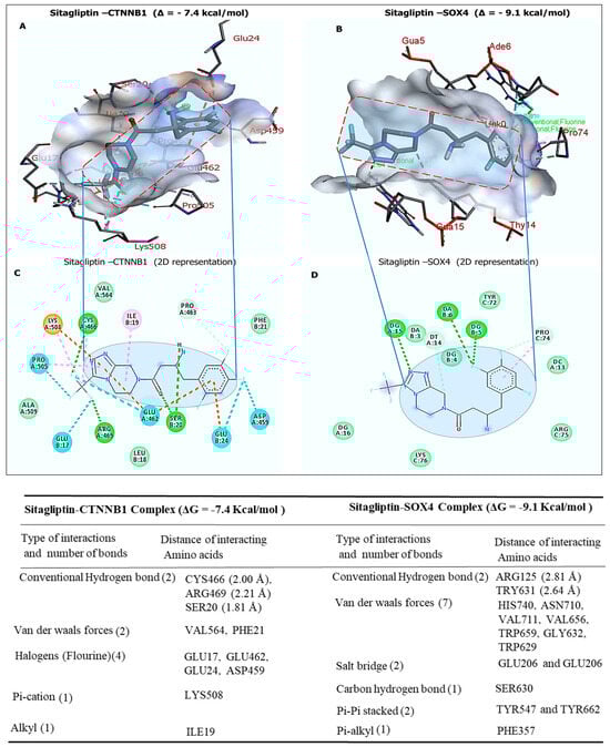 Molecular docking profiles of sitagliptin with SOX4 and CTNNB1(β-catenin). (A,B) Three-dimensional representation showing strong interactions between sitagliptin with CTNNB1 at Δ = −7.4 kcal/mol and of SOX4 Δ = −9.1 kcal/mol, respectively (C,D) Two-dimensional visualization of docking results of conventional hydrogen bonds with their short binding distances of CYS466 (2.00 Å), ARG469 (2.21 Å), and SER20 (1.81 Å), when CTNNB1 bond with sitagliptin and ARG125 (2.81 Å) and TRY631 (2.64 Å), for SOX4 in complex with sitagliptin. The accompanying table shows several interactions, including amino acids, van der Waals forces, carbon–hydrogen bonds, halogens, and pi-pi stacked.