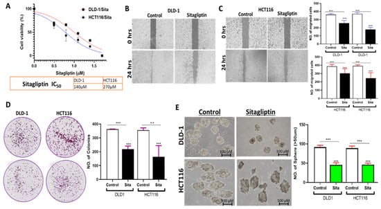 The efficacy of sitagliptin on the viability of CRC cells was evaluated to confirm the predicted outcomes. The results indicated that sitagliptin reduced the viability of DLD-1 and HCT116 cells with IC50 values of 140 µM and 270 µM, respectively (Figure 8A). Additionally, sitagliptin was found to have inhibitory effects on migration, colony and sphere formation of DLD-1 and HCT116 cells (Figure 8B–E).