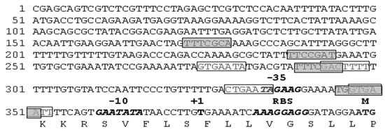 Bioinformatic analysis of the promoter sequence for the B. pumilus 3-19 metalloproteinase was carried out using the BLAST algorithm “https://blast.ncbi.nlm.nih.gov/Blast.cgi (accessed on 13 December 2023)”, in addition to the Vector NTI Suite 8.0 program. The SignalP 6.0 algorithm “https://services.healthtech.dtu.dk/services/SignalP-6.0/ (accessed on 13 December 2023)” was employed to ascertain the probable cleavage site of the signal peptide. This particular algorithm is capable of detecting a functionally active signal peptide within an amino acid sequence. The putative regions recognised by σA for the transcription factor were detected within the promoter of the metalloproteinase gene through the use of the Softberry BPROM network server. The Vector NTI Suite 8.0 program determined potential binding sites for regulatory proteins DegU and Spo0A in the mprBp gene’s regulatory region.