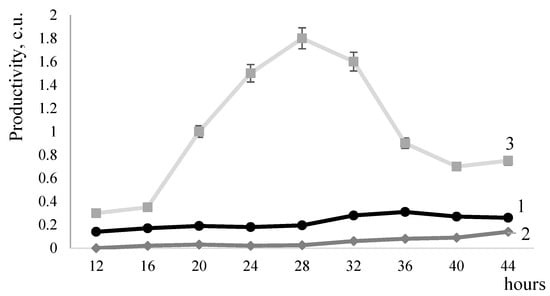 MprBp metalloproteinase productivity. 1—B. subtilis 8g5 pSA1 (control); 2—B. subtilis 8g5ΔdegSΔdegU pSA1, DegS and DegU regulatory protein deficient strain, 3—B. subtilis 8g5 DegU32 (Hy) pSA1 with stabilization of the DegU~P protein phosphorylated form.