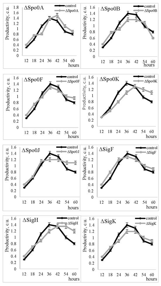 The metalloproteinase gene was cloned into several strains with deleted genes of Spo-system regulatory proteins, derived from B. subtilis strain 168 (trpC2). It was found that the productivity of the metalloendopeptidase in the recombinant strain with a deficient Spo0A regulatory protein was maintained at the level of the strain with the complete Spo0A gene (Figure 3). The MprBp productivity level showed consistent results in strains with defective spore-specific regulatory proteins, namely Spo0B, Spo0F, Spo0K, and Spo0J, and SigF, SigH, and SigK. None of the spo-regulated mutants showed an altered activity level of the MprBp compared to the control strain B. subtilis 168 (trpC2) that expressed the full complement of the corresponding protein. These results suggest that the mprBp gene is independent of Spo-regulatory proteins.