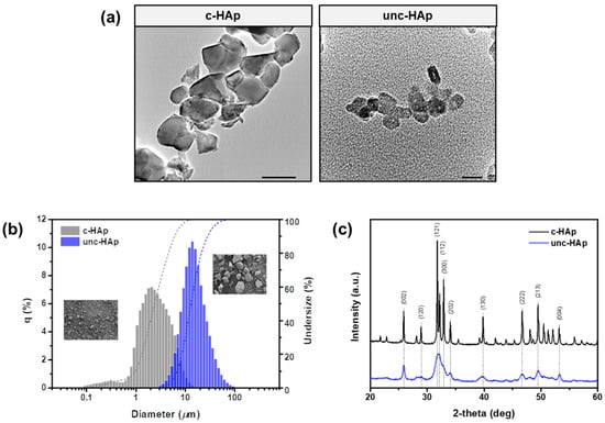 Comparison of c-HAp and unc-HAp characterizations. (a) TEM images, (b) particle size distribution and SEM image, and (c) XRD pattern.