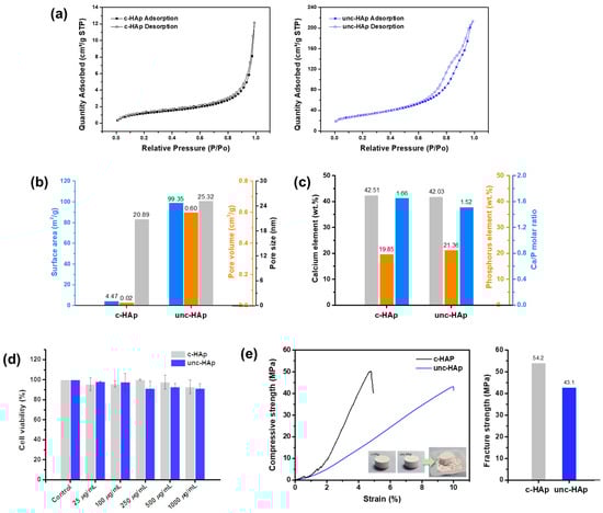 Figure 2 shows the nitrogen adsorption–desorption isotherms, BET parameters, Ca/P ratio, cell viability, and compressive and fracture strength of c-HAp and unc-HAp. Figure 2a shows the nitrogen adsorption–desorption isotherms of c-HAp and unc-HAp. Both c-HAp and unc-HAp are the most consistent with type IV among the physisorption isotherms provided by IUPAC. Also, the surface area was larger for unc-HAp compared to c-HAp. This indicates a decrease in the surface area as calcination progresses, with the hysteresis loop changed to an H1 type from an H5 type [54,55].