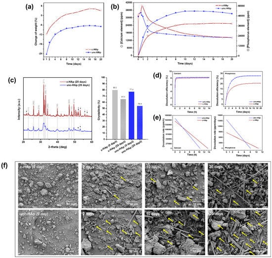 Figure 3 shows the weight change, concentrations of calcium and phosphorus ions, XRD patterns, dissolution efficiency, dissolution rate, and SEM images of c-HAp and unc-HAp, which were evaluated to in vitro dissolution according to ISO 10993-14 [49]. The weight changes of c-HAp and unc-HAp drastically decreased to 12% and 24%, respectively, compared to the initial weight for 1 day, as shown in Figure 3a. The weight loss occurred in c-HAp and unc-HAp due to the removal of mineral constituents. The dissolution of calcium phosphate bioceramics is primarily related to their chemical composition and crystalline characteristics. Also, it is influenced by factors such as the surface area and particle size [60,61,62]. Increasing the surface area enhances the area in contact with the fluids, which leads to a faster dissolution rate. Also, spherical calcium phosphate particles tend to leave small and deep pores, a phenomenon attributed to the incomplete calcination of ceramics when lower calcination temperatures and times are employed [63]. Therefore, due to the higher surface area and pore volume of unc-HAp compared to c-HAp, a more significant weight loss due to dissolution was observed. Subsequently, the c-HAp weight change increased for 16 days, while the unc-HAp weight change increased for 8 days. The weight change after 20 days of dissolution, compared to the initial weight, was increased by 3% for c-HAp and decreased by 7% for unc-HAp. In general, the weight of the powder decreases according to the dissolution time. However, the weight of c-HAp and unc-HAp showed that the weight of the c-HAp and unc-HAp increased continuously after 1 day. This indicates the conclusion that both c-HAp and unc-HAp generate unknown materials during the dissolution process.