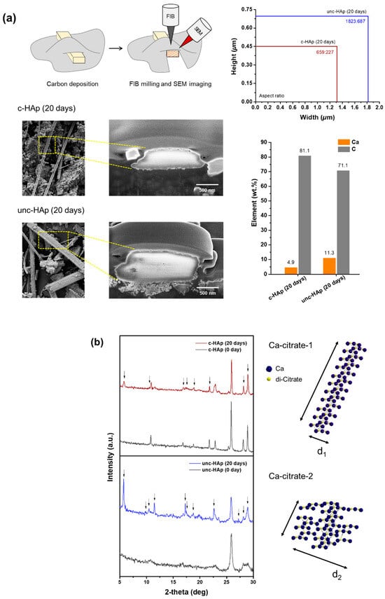 (a) FIB-SEM images showing cross-sectional views, aspect ratio, and EDS results of rod-shaped particles, (b) XRD pattern and molecular modeling of the c-HAp and unc-HAp at 20 days, and (c) schematic representations of c-HAp and unc-HAp in citric acid.