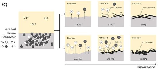 Figure 3f shows the morphological changes in c-HAp and unc-HAp observed over the course of dissolution. Both c-HAp and unc-HAp confirmed the formation of new rod-shaped particles after dissolution. The rod-shaped particles were more abundant in unc-HAp compared to c-HAp, and their quantity increased with time. Additionally, the rod-shaped particles in unc-HAp were thicker and shorter than those in c-HAp. These results could be attributed to the decrease in the concentration of calcium ion and dissolution rate. In particular, it is expected that the thicker and shorter rod-shaped particles in unc-HAp are associated with the rapid dissolution rate. Thus, released calcium was used in the formation of new particles, and as their quantity increases, they tend to become thicker and shorter. These particles are likely to be calcium citrate (Ca-citrate) since they are formed as a result of the removal of calcium ions in a citric acid solution [68]. Consequently, this phenomenon is associated with bioresorption and biomineralization. In general, bioresorption involves resorption cells breaking down the biomaterials and releasing the ions, resulting in a transfer of calcium and phosphate from the biomaterials to the blood. Subsequently, the emitted ions are employed in bone remodeling, a process encompassing biomineralization. In other words, both c-HAp and unc-HAp are dissolved by the citric acid buffer, resulting in the formation of rod-shaped particles through the release of ions. Therefore, it can be inferred that there is a relationship between these processes and bioresorption and biomineralization.