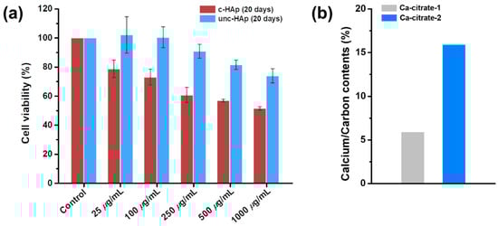 (a) Cell viability through an MTT assay observed during in vitro dissolution assessment of c-HAp and unc-HAp at 20 days, and (b) calcium/carbon contents of Ca-citrate-1 and Ca-citrate-2.