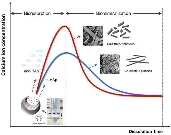 The synthesized unc-HAp had a smaller primary particle size than c-HAp, but a larger aggregated particle size. In addition, the surface area and pore volume were far higher. With these material properties, the bioresorption and biomineralization of unc-HAp were higher than c-HAp. Accordingly, more newly formed rod-shaped particles were observed in unc-HAp as the dissolution time increased, and the morphology of these particles was shorter and thicker than the newly formed rod-shaped particles in c-HAp. These particles were identified as Ca-citrate in both c-HAp and unc-HAp, but unc-HAp had much higher calcium content and cell viability. Therefore, unc-HAp is more suitable as a main material for bone regeneration than c-HAp. These results ensure the long-term safety and biocompatibility of unc-HAp, indicating its potential application as a key material in the medical industry.