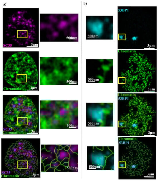The comparison of chromatin and interchromatin was performed by comparing the DNA label with the SC35 splicing factor. SC35 shows speckle-like structures in the regions with low DNA staining intensity (Figure 1a). The channels of the IC containing SC35 pervade the chromatin through the whole cell nucleus. Quantitative correlation analysis shows that (29 ± 9)% of the SC35-positive regions overlap with chromatin. This overlap is located in the border region between the two analyzed structures. By reducing the chromatin signal to the visible connections, which was performed using the skeletonize tool from ImageJ as described in the Section 4, the complex chromatin network can be visualized and the chromatin branches and their overlap with other labeled structures can be measured. The chromatin merely passes by the SC35 positive regions, and only a few ends touch the edges of the SC35 label.