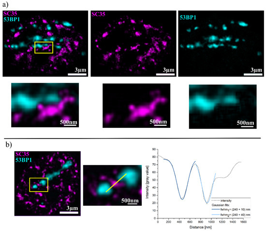 Figure 2. (a) HeLa cells with SC35 interchromatin labeling (magenta) and 53BP1 labeling of carbon-ion-induced damage (cyan). The first column shows the overlay, and the second and third columns show SC35 and 53BP1, respectively. The second line shows the zoom of the yellow box. (b) Example analysis of the buffer zone. IRIFs are enlarged, and a line is drawn between 53BP1 and SC35, perpendicular to the 53BP1 signal surface. The figure shows the analysis of two separate buffer zones within the ROI. The intensity profile is shown on the right. The two dips in intensity were analyzed using a Gaussian fit. No threshold was used for the image data shown.