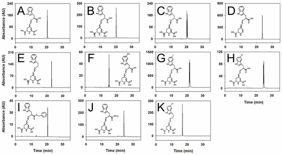 Structures and chromatograms of pure tryptophan-derived betaxanthins. HPLC chromatograms are shown at 480 nm of each individual betalain or racemic mixture. (A) L-tryptophan-betaxanthin, (B) D-tryptophan-betaxanthin, (C) DL-tryptophan-betaxanthin, (D) L-tryptophan-6-decarboxy-betaxanthin, (E) tryptamine-betaxanthin, (F) 5-hydroxy-L-tryptophan-betaxanthin, (G) 5-fluoro-DL-tryptophan-betaxanthin, (H) 5-bromo-DL-tryptophan-betaxanthin, (I) L-tryptophan-benzyl ester-betaxanthin, (J) L-tryptophan methyl ester-betaxanthin, and (K) serotonin-betaxanthin. The injection volume was 50 μL.