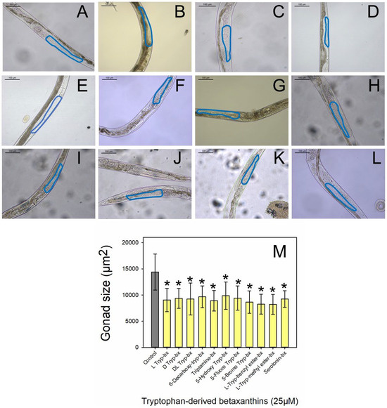 Sizes of tumoral gonads in C. elegans. Representative images of C. elegans JK1466 strain (A) without treatment (control) and with different treatments: (B) L-tryptophan-betaxanthin, (C) D-tryptophan-betaxanthin, (D) DL-Tryptophan-betaxanthin, (E) L-tryptophan-6-decarboxy-betaxanthin, (F) tryptamine-betaxanthin, (G) 5-hydroxy-L-tryptophan-betaxanthin, (H) 5-fluoro-DL-tryptophan-betaxanthin, (I) 5-bromo-DL-tryptophan-betaxanthin, (J) L-tryptophan-benzyl ester-betaxanthin, (K) L-tryptophan methyl ester-betaxanthin, and (L) serotonin-betaxanthin. Scale bar: 50 µm. (M) Gonad size histograms (mean values ± SD) of gld-1 mutants control (n = 243) and treated with the different tryptophan-derived betaxanthins (n ≥ 56). bx: betaxanthin. * indicates a statistically significant difference in values (p ≤ 0.05) with respect to the data obtained for controls. Scale bar: 100 µm.